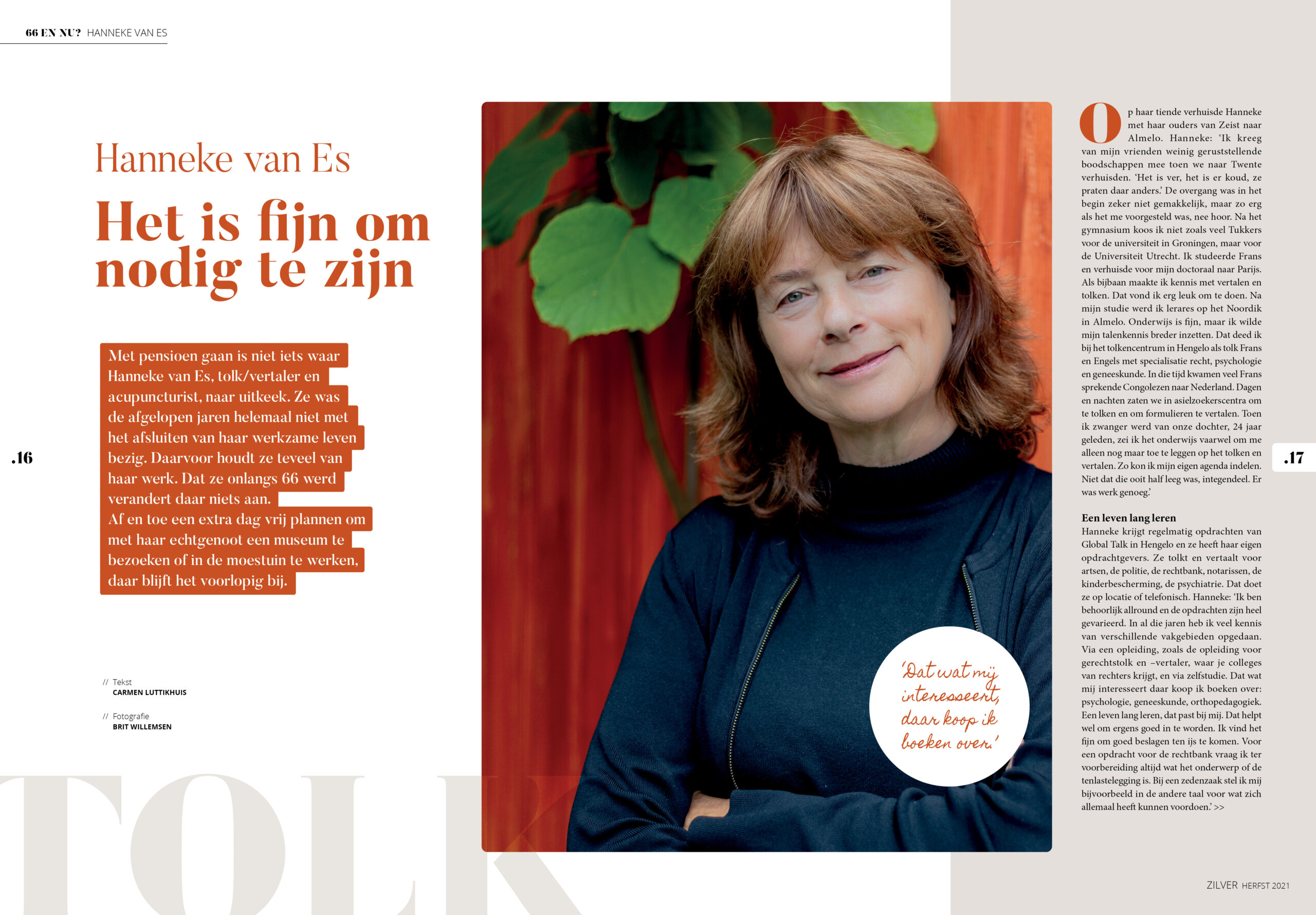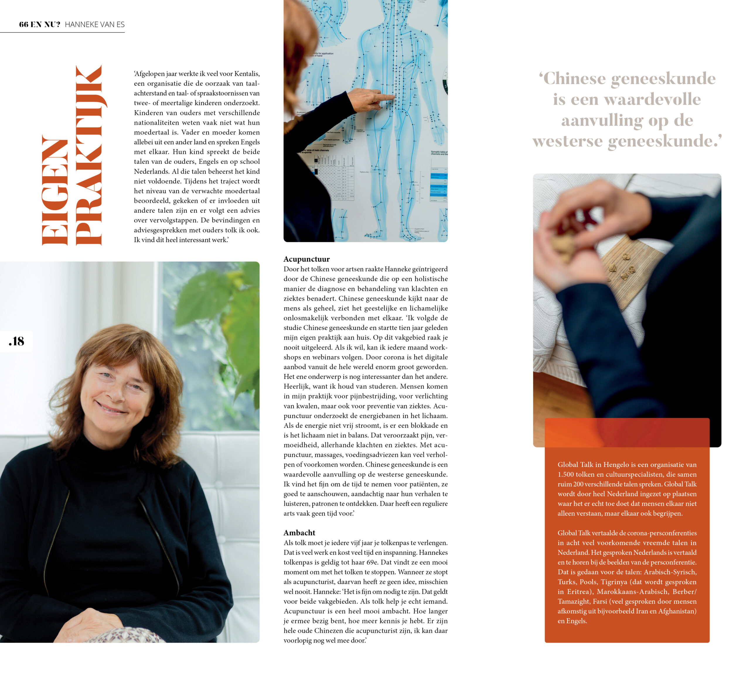 Met pensioen gaan is niet iets waar Hanneke van Es, tolk/vertalen en acupuncturist, naar uitkeek. Ze was de afgelopen jaren helemaal niet met het afsluiten van haar werkzame leven bezig. Daarvoor houdt ze teveel van haar werk. Dat ze onlangs 66 werd verandert daar niets aan. Af en toe een extra dag vrij plannen om met haar echtgenoot een museum te bezoeken of in de moestuin te werken, daar blijft het voorlopig bij.